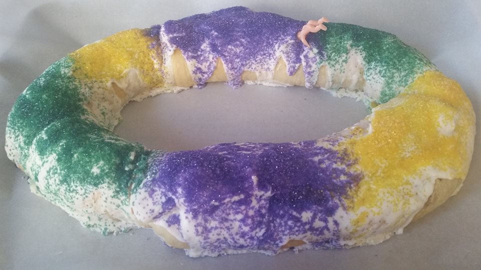Feel free to pass them along. The cake is made with a rich Danish dough baked and covered with a sugar topping in Mardi Gras colors. In the mid-1900s a small plastic baby became the symbol of this Holy Day and was placed inside of each King Cake.
