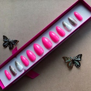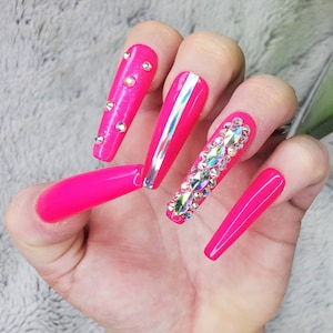 Duchess Bright Pink Press On Nails With Bling And Sliver Etsy