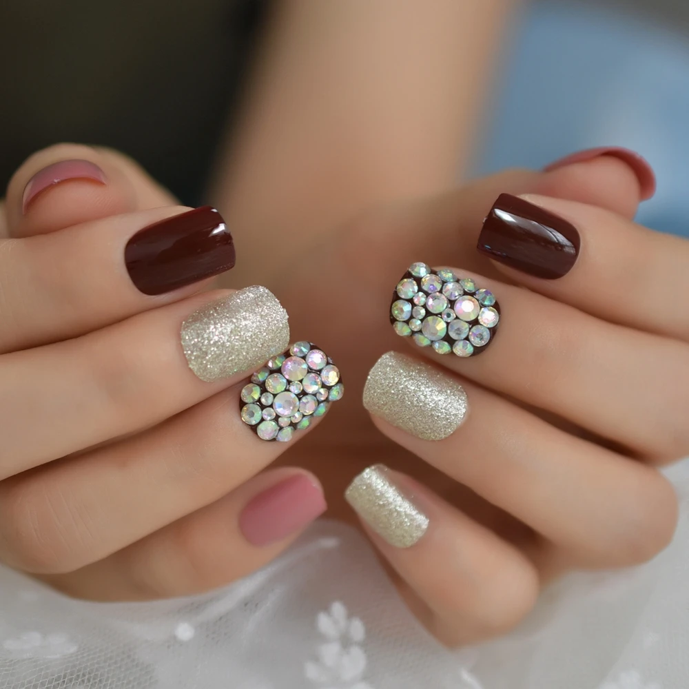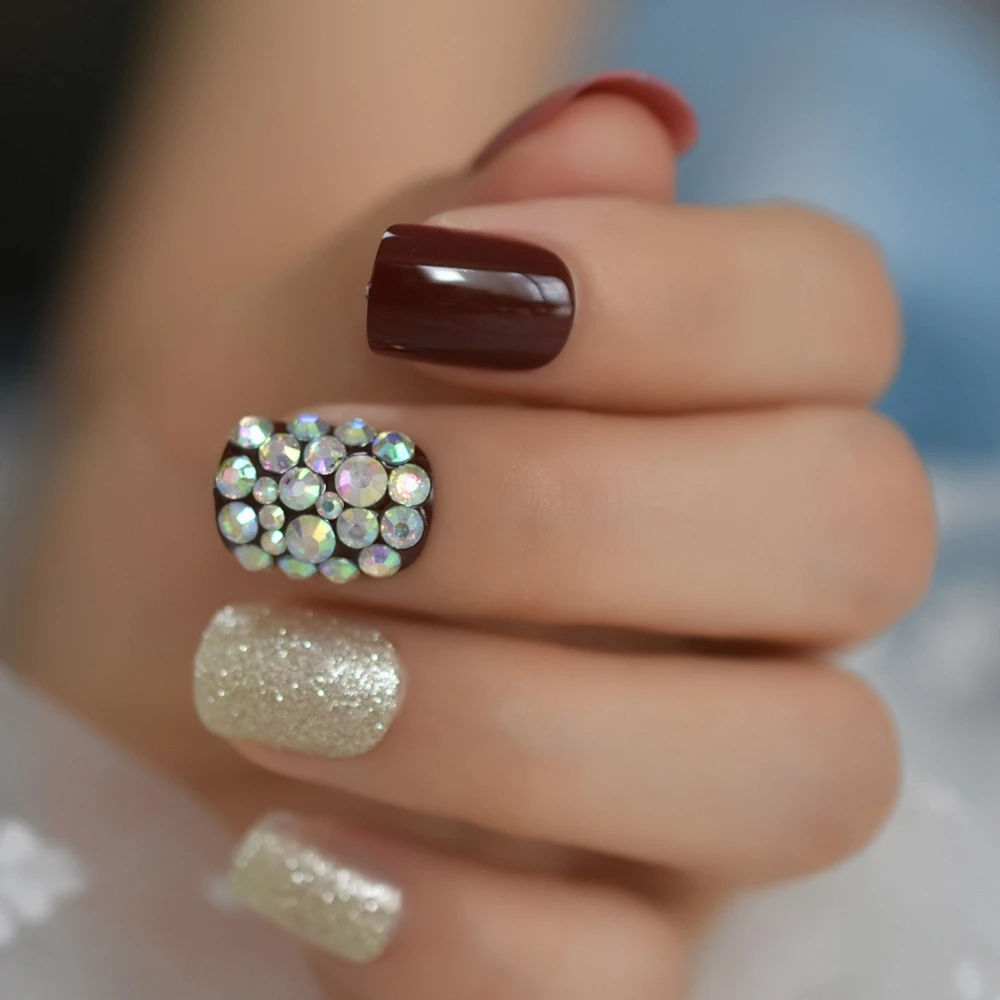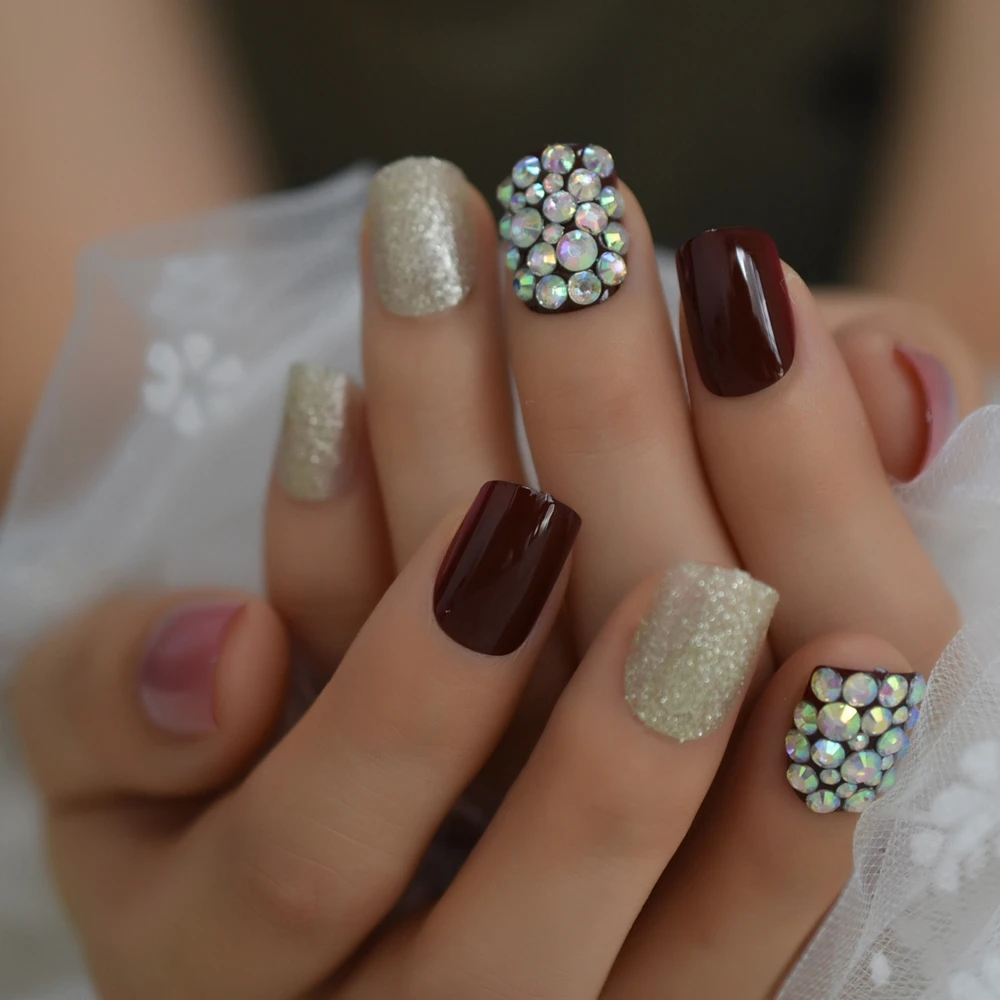 Crystal Stones Press On Nails Custom Glitter Gold Cherry Color Artificial Finernails Square Short Tips Predesigned False Nails Aliexpress