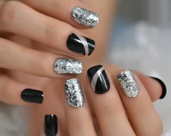 Amazon Com Coolnail Sparkly Silver Glitter False Nails Short Classic Black Press On Fake Nails Full Cover Acrylic Bling Wear Nail Art Accessories Beauty
