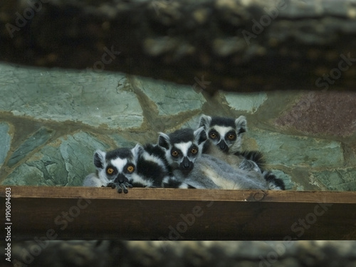 Three Young Ring Tailed Lemurs Lemur Catta Are Cuddling Together And Looking At Camera The Lemurs Have Fluffy Grey Hair Touching Snouts Crooked Fingers And Big Expressive Eyes Stock Photo Adobe Stock