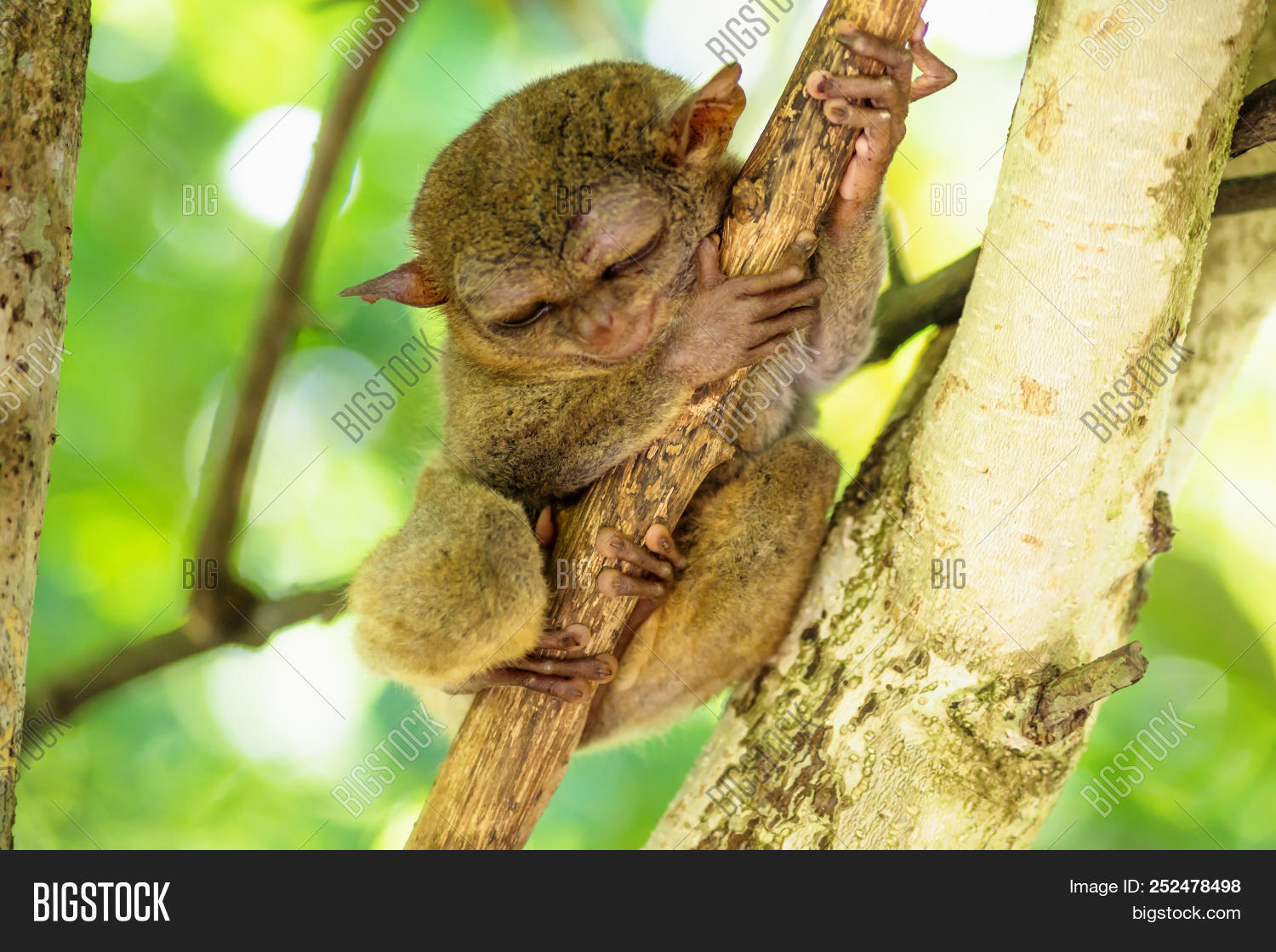 Tarsier With Big Closed Eyes On A Branch In Bohol Philippines Asia Image Stock Photo 252478498