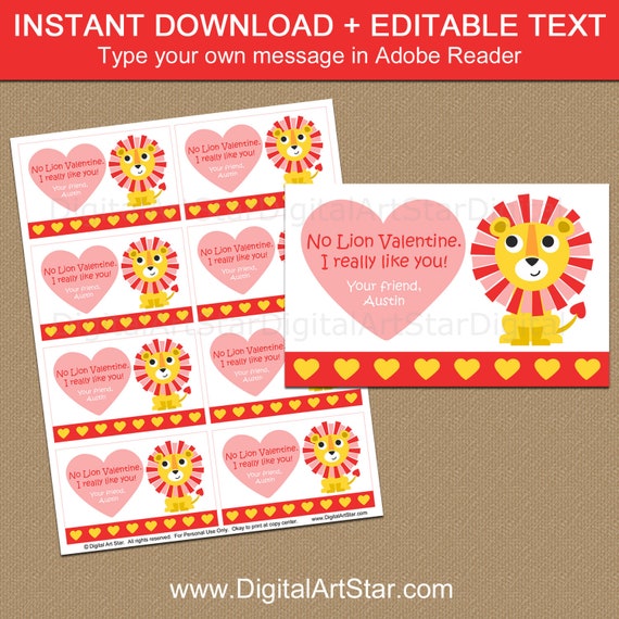 Lion Valentine Printable Cards For Kids School Valentines Day Cards Lion Stickers Valentine Gift Labels Valentine Tags Template By Digital Art Star Catch My Party