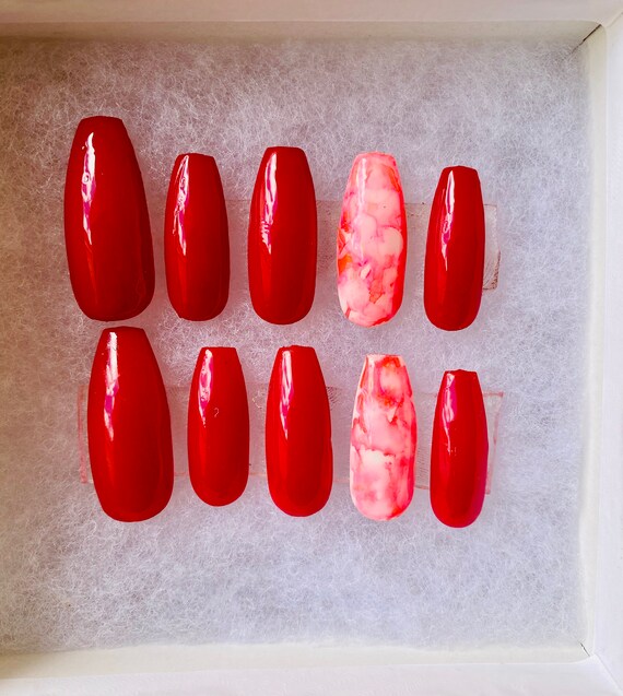 Red Coffin Shaped With One Marble Accent Nail Etsy