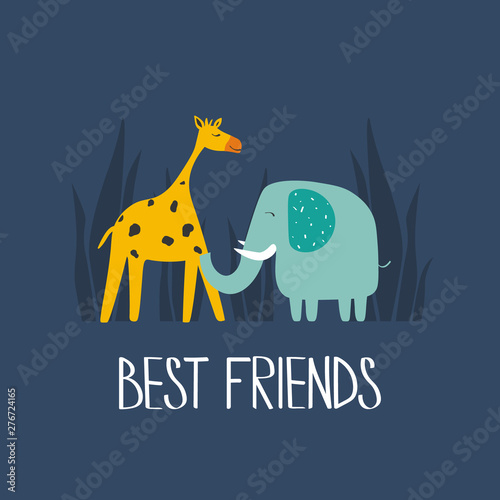 Illustration With Giraffe Elephant And English Text Poster Design Colorful Background Vector Best Friends Funny Concept Cartoon Wallpaper Hand Drawn Backdrop Stock Vector Adobe Stock