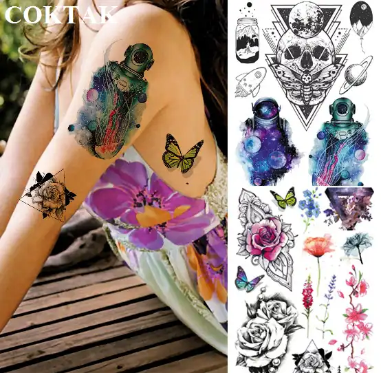 Coktak Death Skull With Moth Moon Temporary Tattoos Triangle Sticker Universe Astronaut Planets Custom Tattoo For Women Female Temporary Tattoos Aliexpress