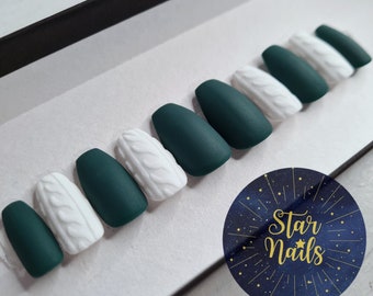 50 Elegant Emerald Christmas Green Nail Designs You Shoud Do For The Coming Valentines Day - Cute Hostess For Modern Women. A set of quality handmade press-on nails in the design Knitted which features matte forest green nails with white knitted effect nails which are textured to touch. For custom sizing leave your measurements under personalization.