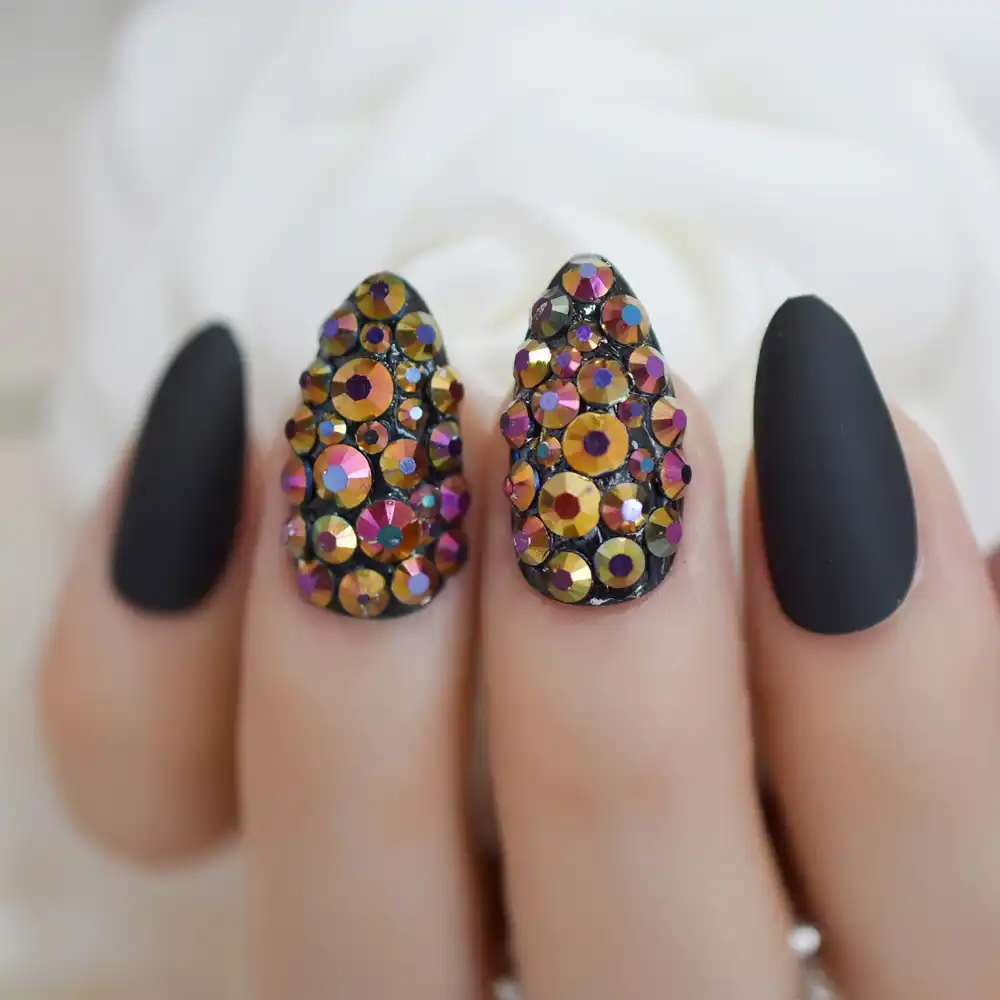 Amazon Com Coolnail 3d Press On Nails Rose Black Bling Gems Matte Stiletto Fake False Nails Almond Frosted Oval Short Pointed Full Cover Faux Ongles Beauty